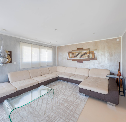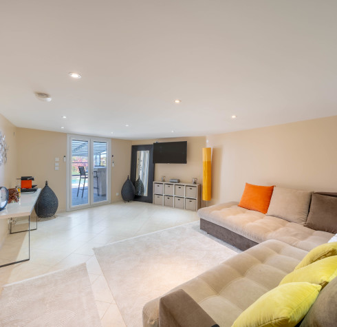 Au niveau inférieur, un vaste salon / espace jeux avec accès direct à la terrasse et à la piscine, une grande chambre avec salle d’eau et WC, un placard attenant, ainsi qu’une autre grande salle d’eau WC avec la possibilité d’installer un sauna.